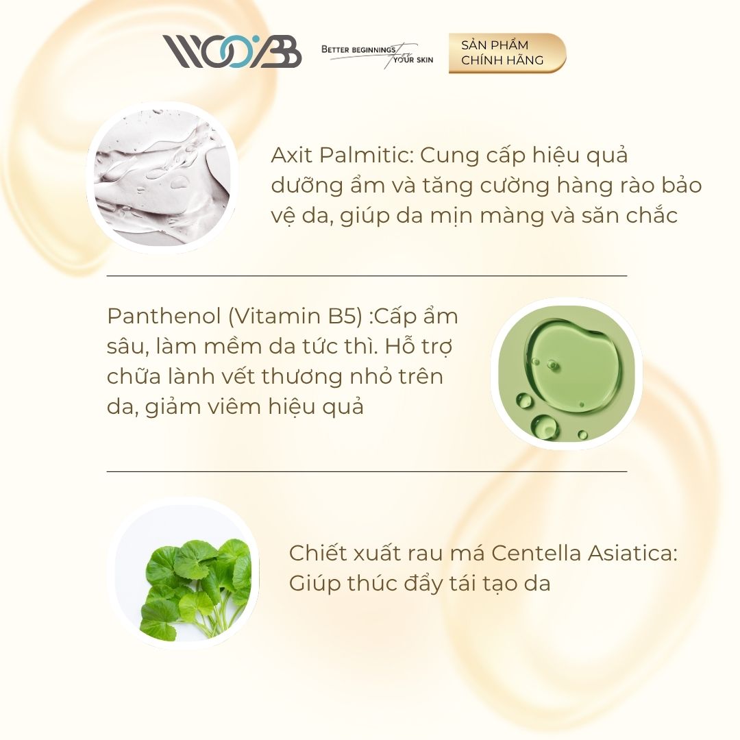 – Chiết xuất rau má Centella Asiatica: Giúp thúc đẩy tái tạo da. Có hiệu quả trong việc phục hồi vết thương trên da hoặc kích ứng và kích thích sản xuất tế bào mới.
